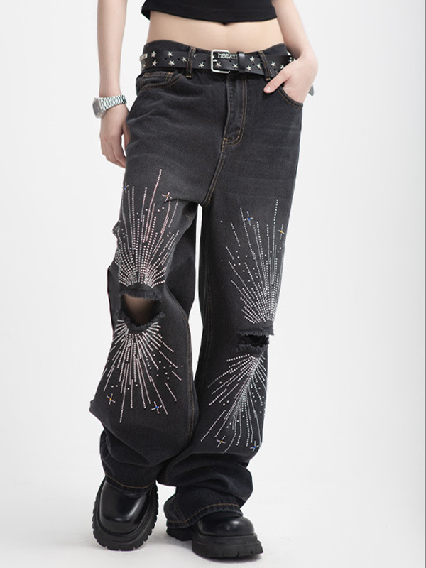 Zerrissene Jeans mit geradem Bein und Feuerwerk-Strassmuster für Herren