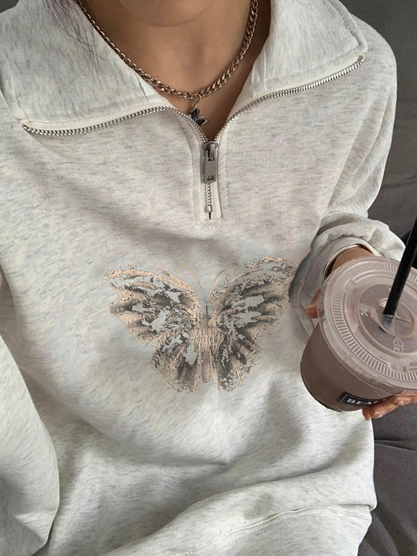 Sweatshirt mit Schmetterlingsdruck und Reverskragen und halbem Reißverschluss