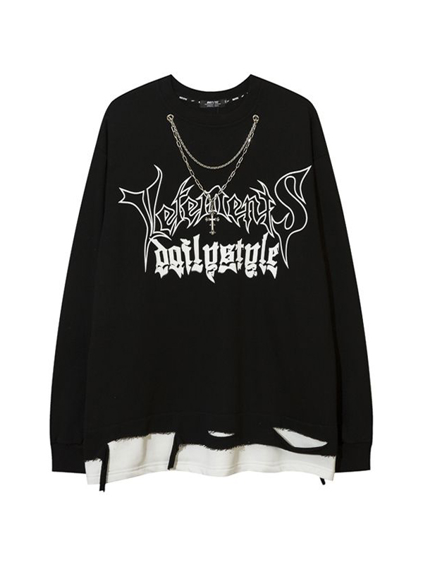 Gefälschte zweiteilige Loch Design Kette lose dunkle Print Sweatshirt