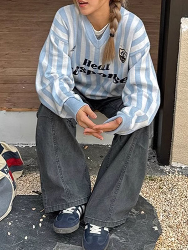 Gestreifter Pullover mit V-Ausschnitt im amerikanischen Retro-Stil