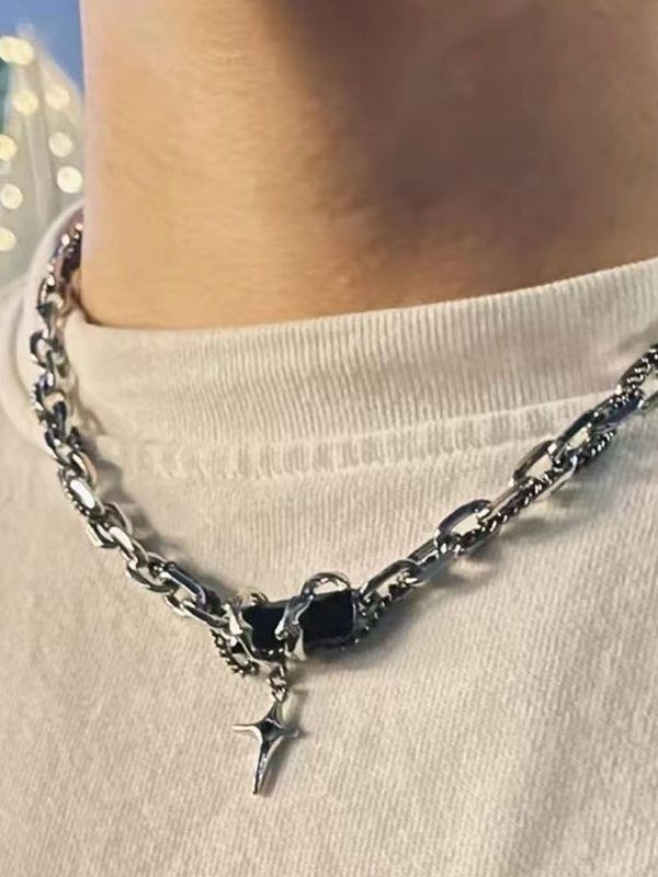 Herren-Halskette mit zweilagigem Bindfaden und schwarzem Edelstein-Kreuz-Anhänger Menge