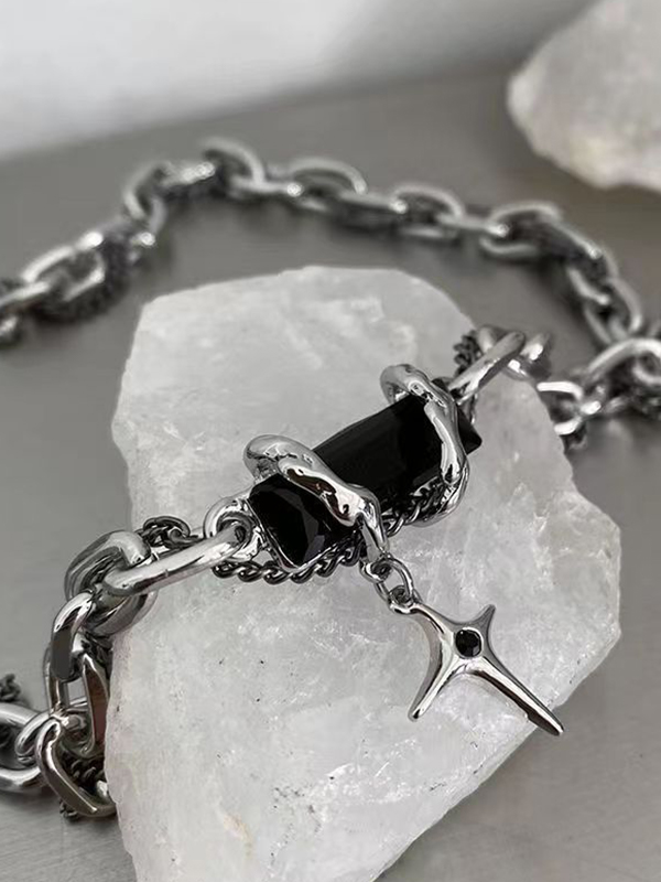 Herren-Halskette mit zweilagigem Bindfaden und schwarzem Edelstein-Kreuz-Anhänger