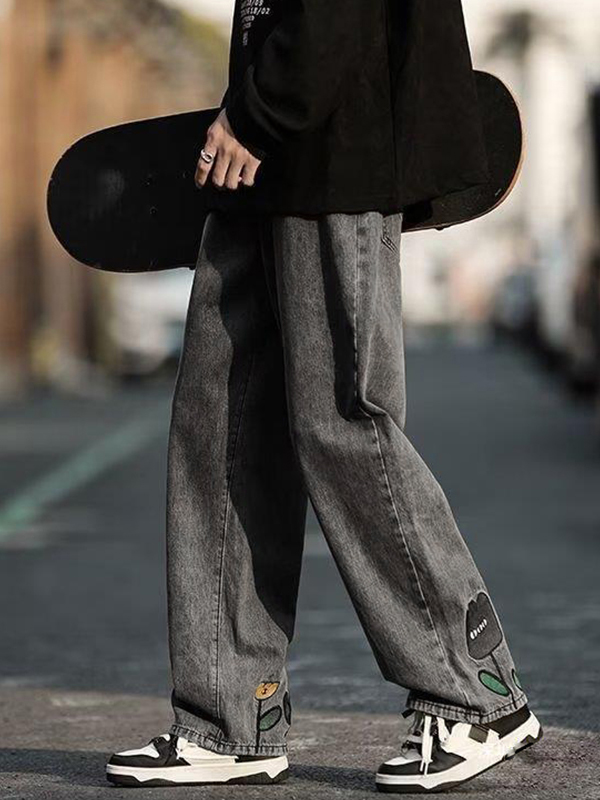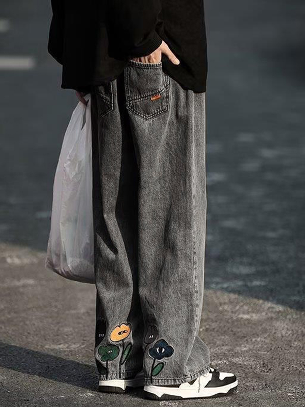 Herren-Jeans im Distressed-Look mit interessanter Blumenstickerei