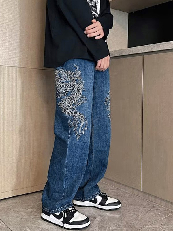 Herrenjeans mit geradem Bein und Drachenstickerei