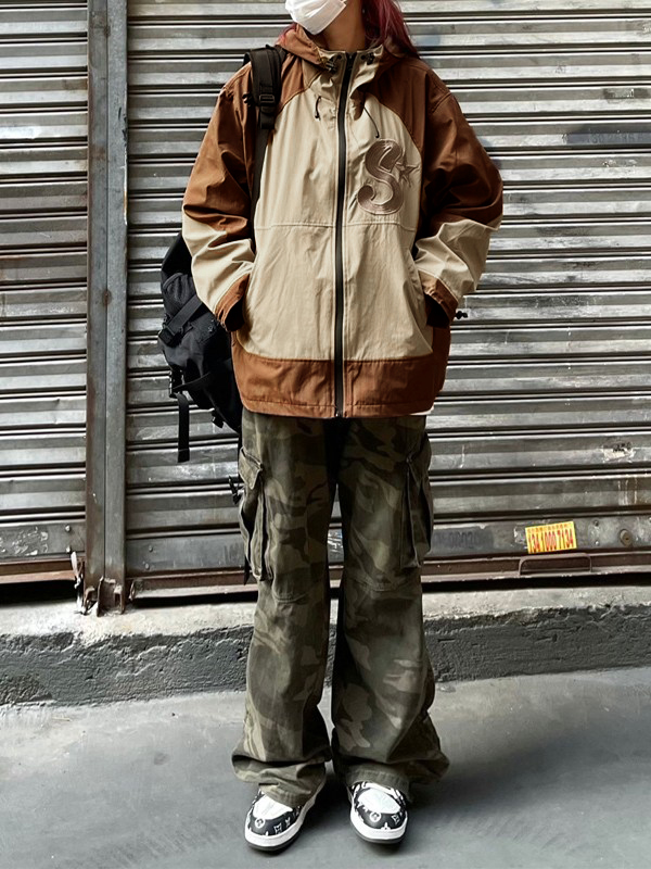 Oversize-Stickerei-Farbblock-Kapuzenjacke mit Reißverschluss