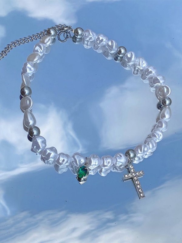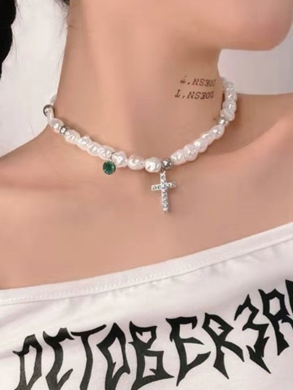 Strass-Kreuz-Anhänger Faux-Perlen-Halskette