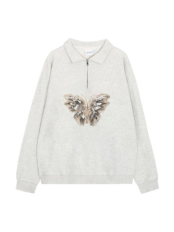 Sweatshirt mit Schmetterlingsdruck und Reverskragen und halbem Reißverschluss