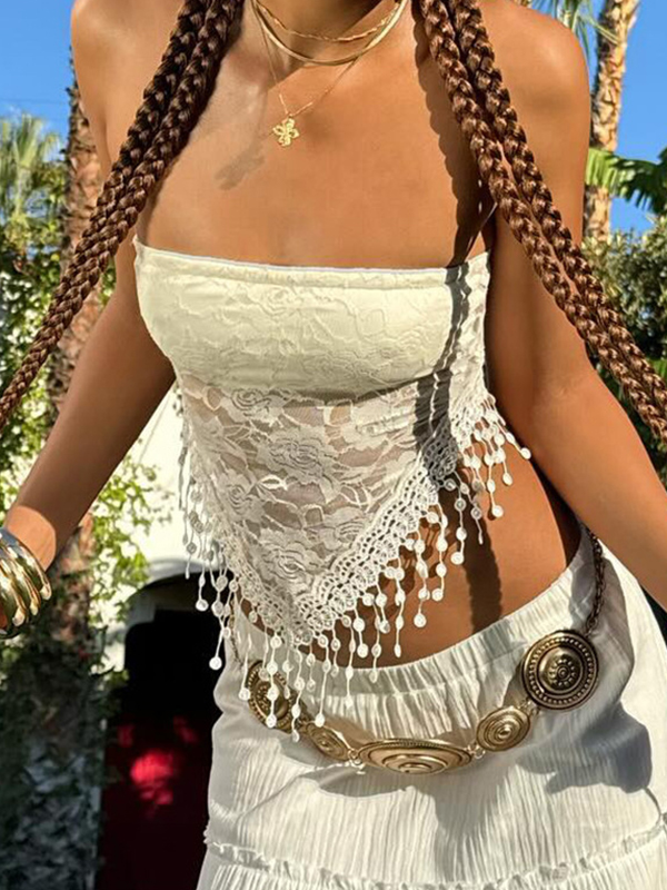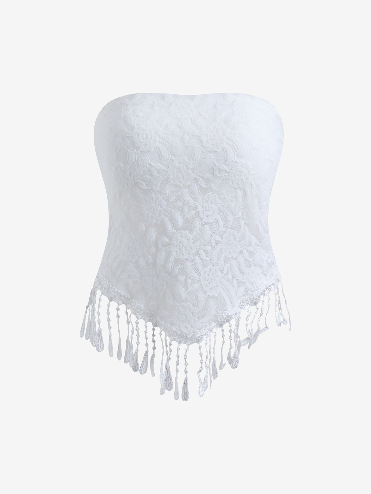 Trägerloses Bandeau-Top aus Spitze mit unregelmäßigen Fransen